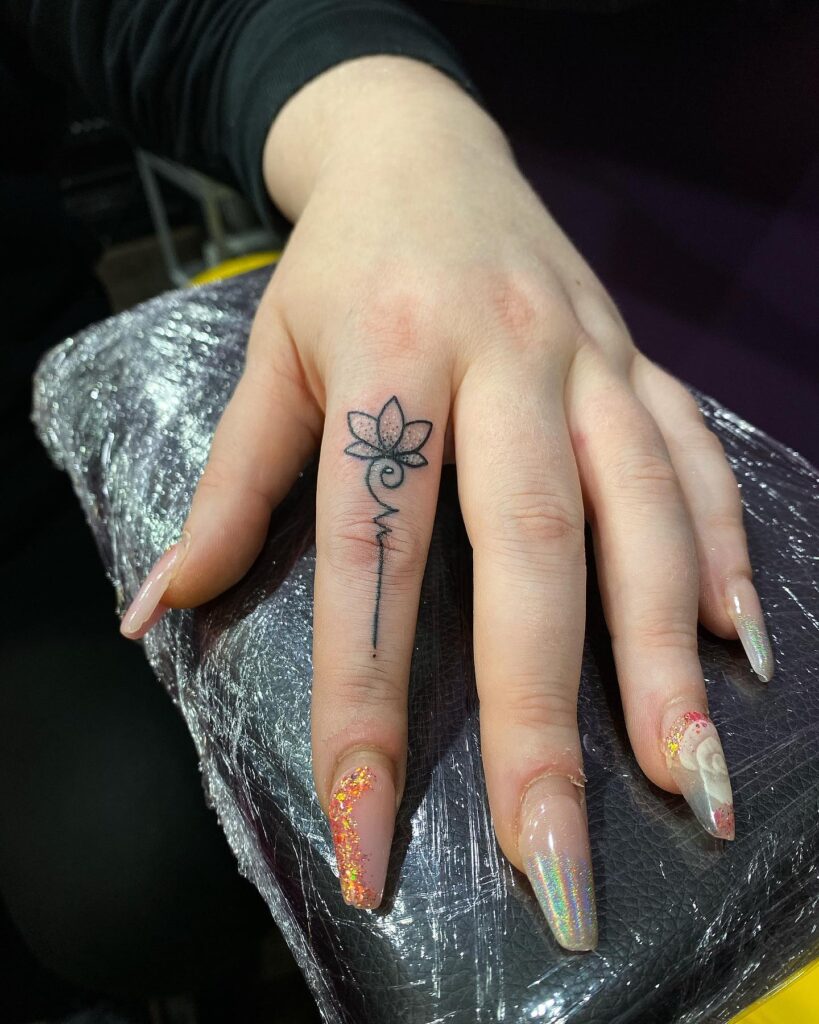 This tattoo displays a delicate lotus flower at the top of the finger, with a thin line extending downward to create balance and flow. The lotus is a universal symbol of purity, growth, and enlightenment, often representing triumph over challenges. Its placement on the finger allows the wearer to carry a constant reminder of resilience and beauty through transformation.
