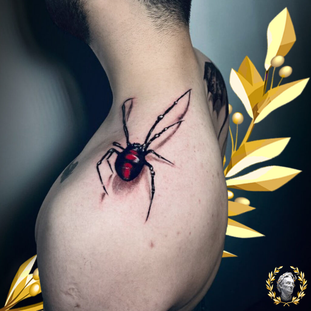 This tattoo features a vivid black widow with a glowing red abdomen, inked along the upper shoulder. The detailed shading makes it appear lifelike, as if crawling across the skin. Its sharp, defined legs add realism, while the red hourglass glows with intensity, symbolizing danger, resilience, and feminine power.