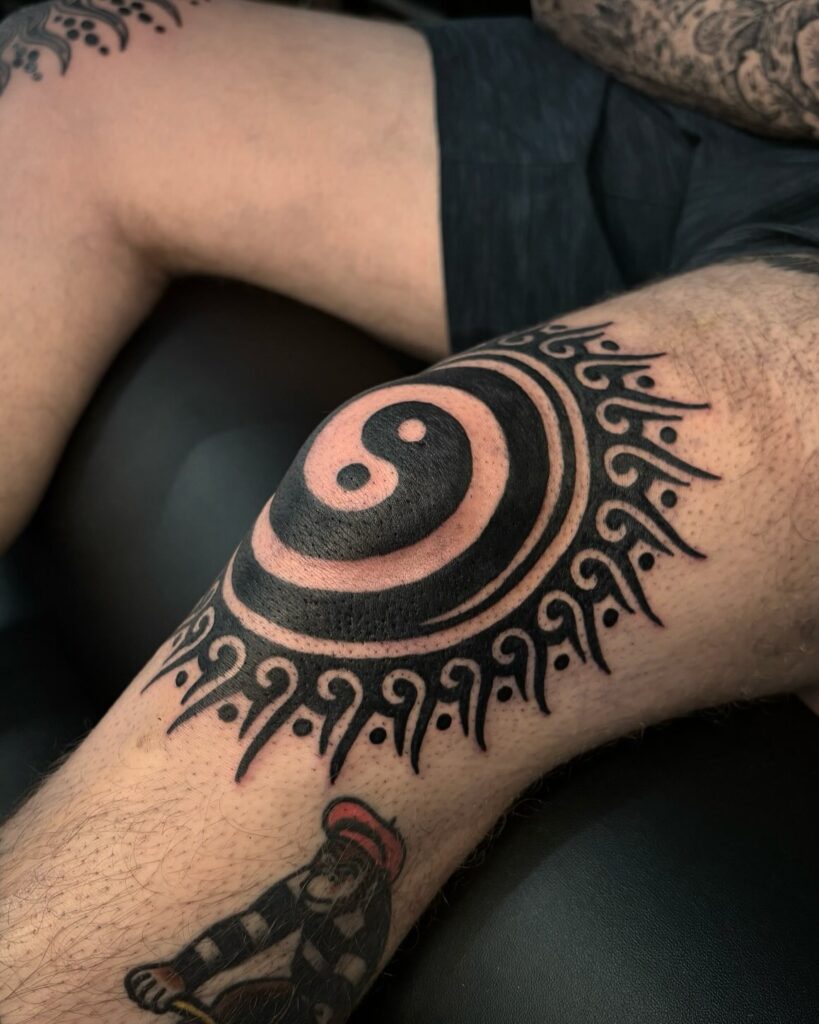 This bold mandala tattoo centers around the iconic yin-yang symbol, surrounded by symmetrical tribal-inspired patterns radiating outward. The placement on the knee makes it visually dynamic, moving with the bend of the leg, symbolizing balance and adaptability. The heavy black ink contrasts sharply with the skin, giving the design a powerful presence.