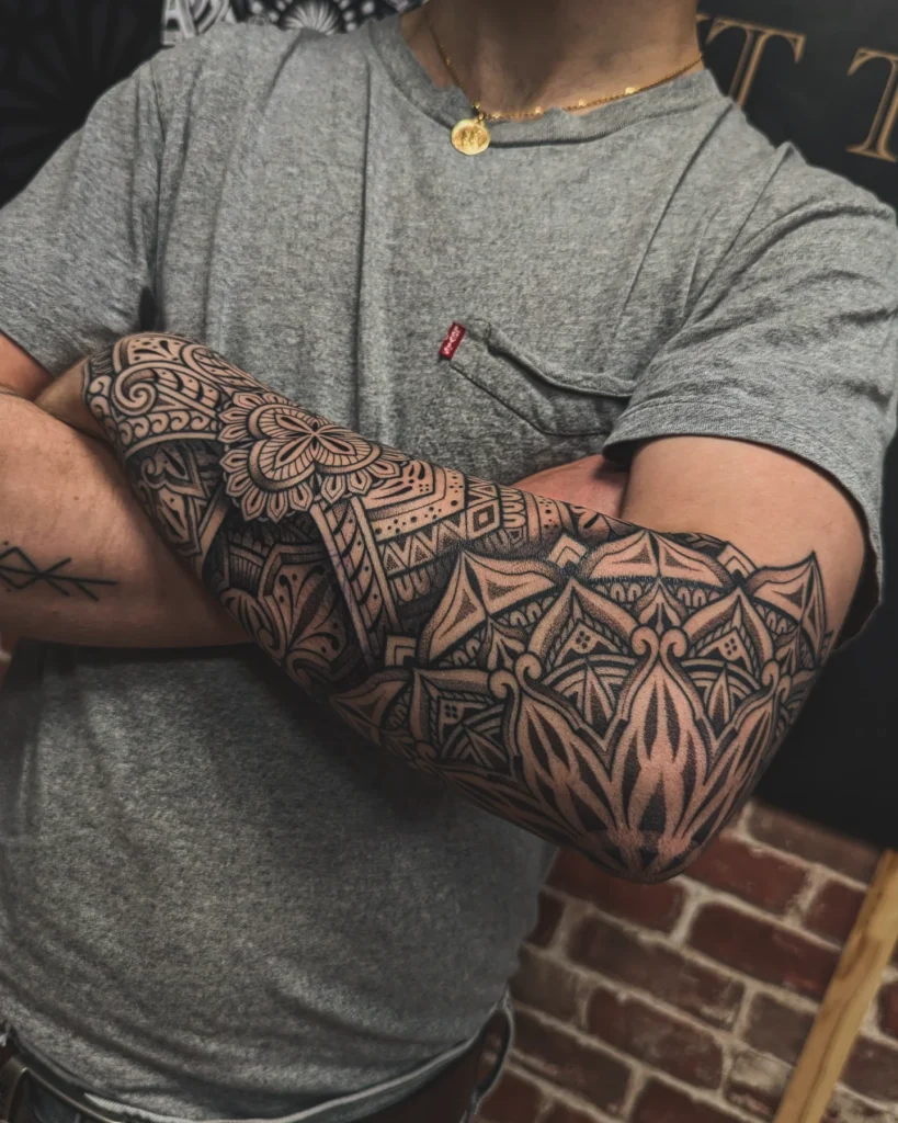 Rich in detail, this forearm sleeve tattoo combines ornamental mandala elements with geometric layering. The design features floral symmetry, intricate dot shading, and bold black sections, creating a striking contrast. Each mandala motif connects seamlessly, flowing with the arm’s shape and enhancing its natural form.